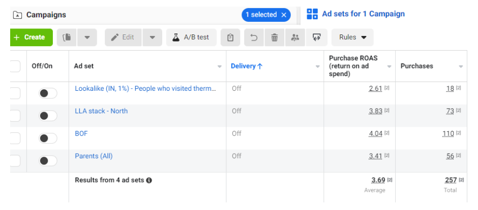 We started testing our creative variations in a Sandbox Campaigns for creative testing. The team launched ads onto broad audiences and observed what creatives got the maximum scale, sustainability & longevity. Since we were testing creatives here, we had just one creative per adset.