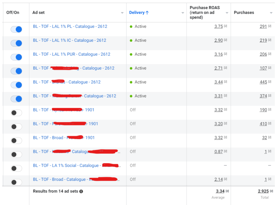 Set up new audiences in the Sandbox campaigns, as seasonality shift has happened, we will launch them with pre validated audiences ( LAA1% of LPV, ATC, IC, Purchase, Top Interests and Broad) to see what scales with a minimum of BE.ROAS